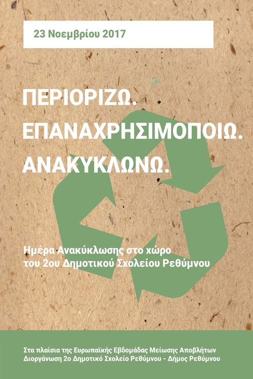 Δράση ευαισθητοποίησης κι ενημέρωσης των παιδιών και των εκπαιδευτικών του 2ου Δημοτικού Σχολείου σε θέματα ανακύκλωσης θα πραγματοποιηθεί την ερχόμενη Πέμπτη 23 Νοεμβρίου 2017. Η εκδήλωση εντάσσεται στο πλαίσιο της Ευρωπαϊκής Εβδομάδας Μείωσης Αποβλήτων που έχει ανακηρυχθεί η εβδομάδα που διανύουμε (18-26 Νοεμβρίου 2017) με Εθνικό Συντονιστή των δράσεων πρόληψης και μείωσης των αποβλήτων τον Ελληνικό Οργανισμό Ανακύκλωσης.