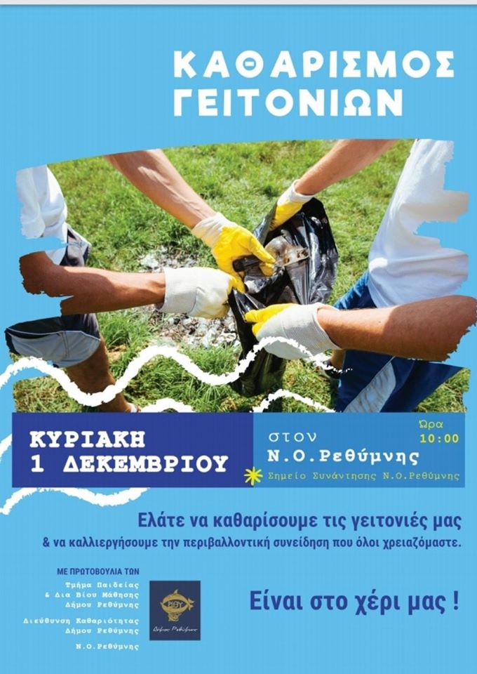 Μία ακόμη πρωτοβουλία με στόχο την καλλιέργεια περιβαλλοντικής συνείδησης στην πράξη, προστίθεται στο Περιβαλλοντικό Πρόγραμμα «Καθαρισμός Γειτονιών» που εγκαινίασε το Τμήμα Παιδείας, Δια Βίου Μάθησης & Κοινωνικής Πολιτικής του Δήμου Ρεθύμνης με επικεφαλής την αρμόδια Αντιδήμαρχο κα Αννα Ελευθεριάδου – Γκίκα, με την υποστήριξη της Υπηρεσίας Καθαριότητας, Αστικού Περιβάλλοντος και Πρασίνου του Δ.Ρ., εθελοντών, φορέων και Σωματείων της πόλης.