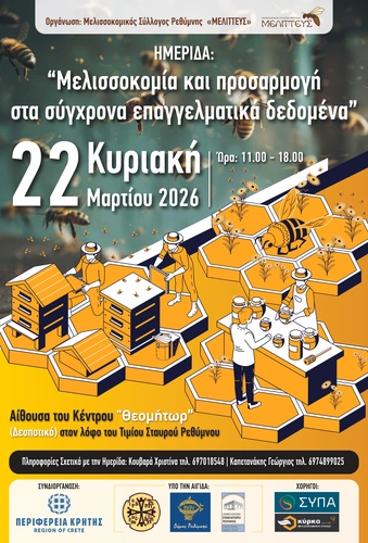 Ο Μελισσοκομικός Σύλλογος Ρεθύμνης «ΜΕΛΙΤΤΕΥΣ» προσκαλεί τα μέλη του αλλά και κάθε ενδιαφερόμενο στην ημερίδα με θέμα:
